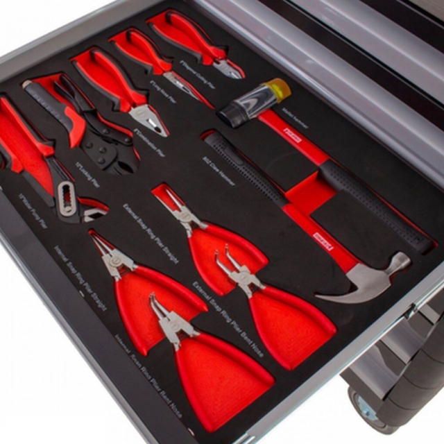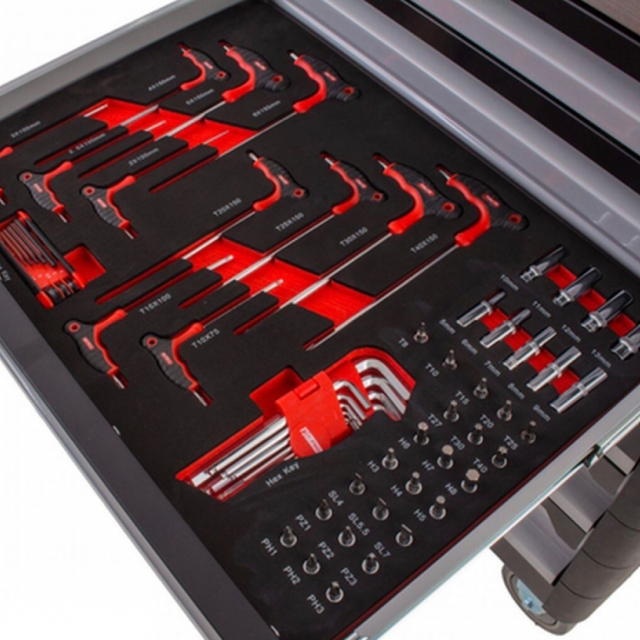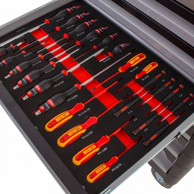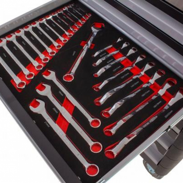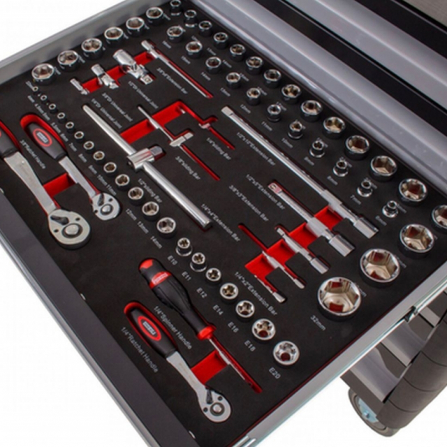 Dieser Werkzeugwagen aus der JET-Reihe verfügt über sieben kugelgelagerte Schubladen, 5 gefüllte Tabletts mit Stahlwerk-Werkzeugen. Das Werkzeug ist in fünf robusten Moosgummimodulen gelagert und dadurch optimal geschützt. Anhand der Schaumstoffeinlagen können Sie nach der Arbeit leicht erkennen, ob der Werkzeugsatz komplett ist. Dieser Werkzeugwagen wird einfach durch den stabilen Lenker und die robusten vier Räder, zwei schwenkbare Räder mit Feststellern, bewegt. Dieser Werkzeugwagen ist mit zwei am Zylinderschloss anliegenden Schlüsseln vollständig verschließbar. Das Auto hat eine extra starke Edelstahlplatte.