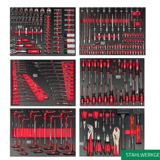 In this tool trolley you will find an extensive 295-piece tool set including a complete socket set with ratchets in three different sizes: 1/2", 1/4" and 3/8". The screwdrivers in this tool trolley are professional quality and fitted on the head with a hex for extra strength with a wrench or hammer You will also find a fully insulated screwdriver set in the car.