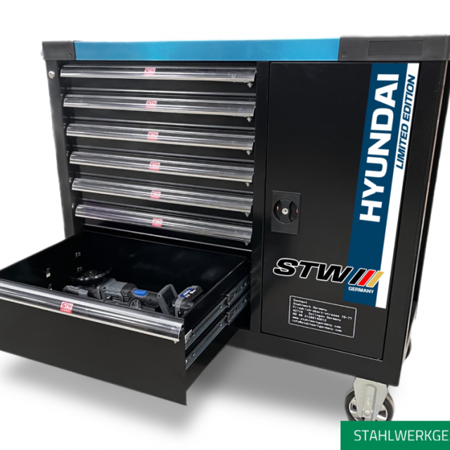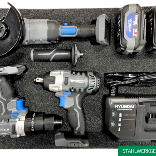 The lower drawer is filled with heavy duty tools from HYUNDAI POWER PRODUCTS 20V 5.0ah and is tidied away in a foam module.