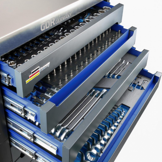 The GDR9 Tool Trolley from GDR Werkzeuge combines functionality with ease of use and is an indispensable addition to any workshop. With nine spacious drawers and a comprehensive set of included tools, this trolley offers everything you need to work organised and efficiently.