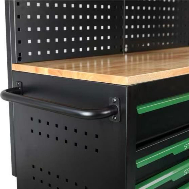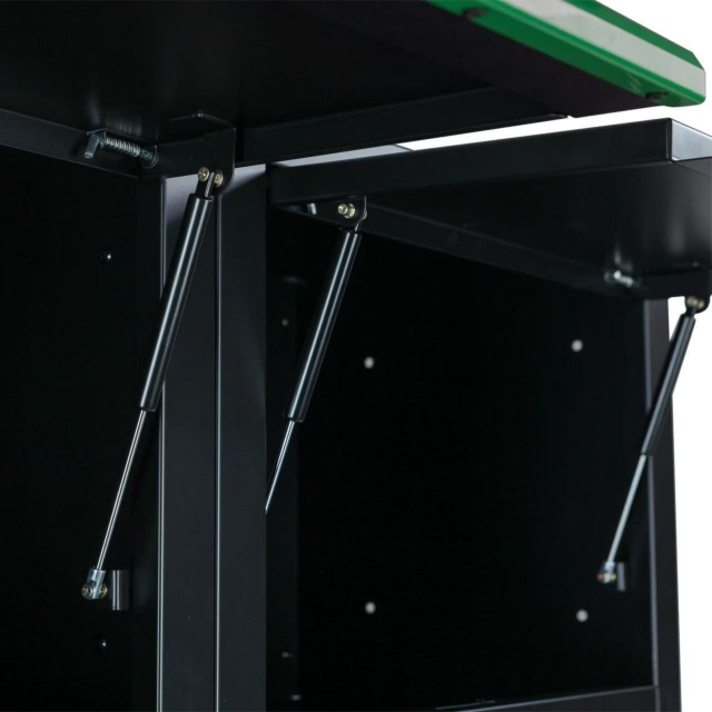 The robust wooden worktop provides a practical and sturdy base for assembly and maintenance tasks. In addition, the trolley is equipped with a convenient rear panel that has an integrated extension cord with three sockets, making it easy to connect power tools without loose cables.